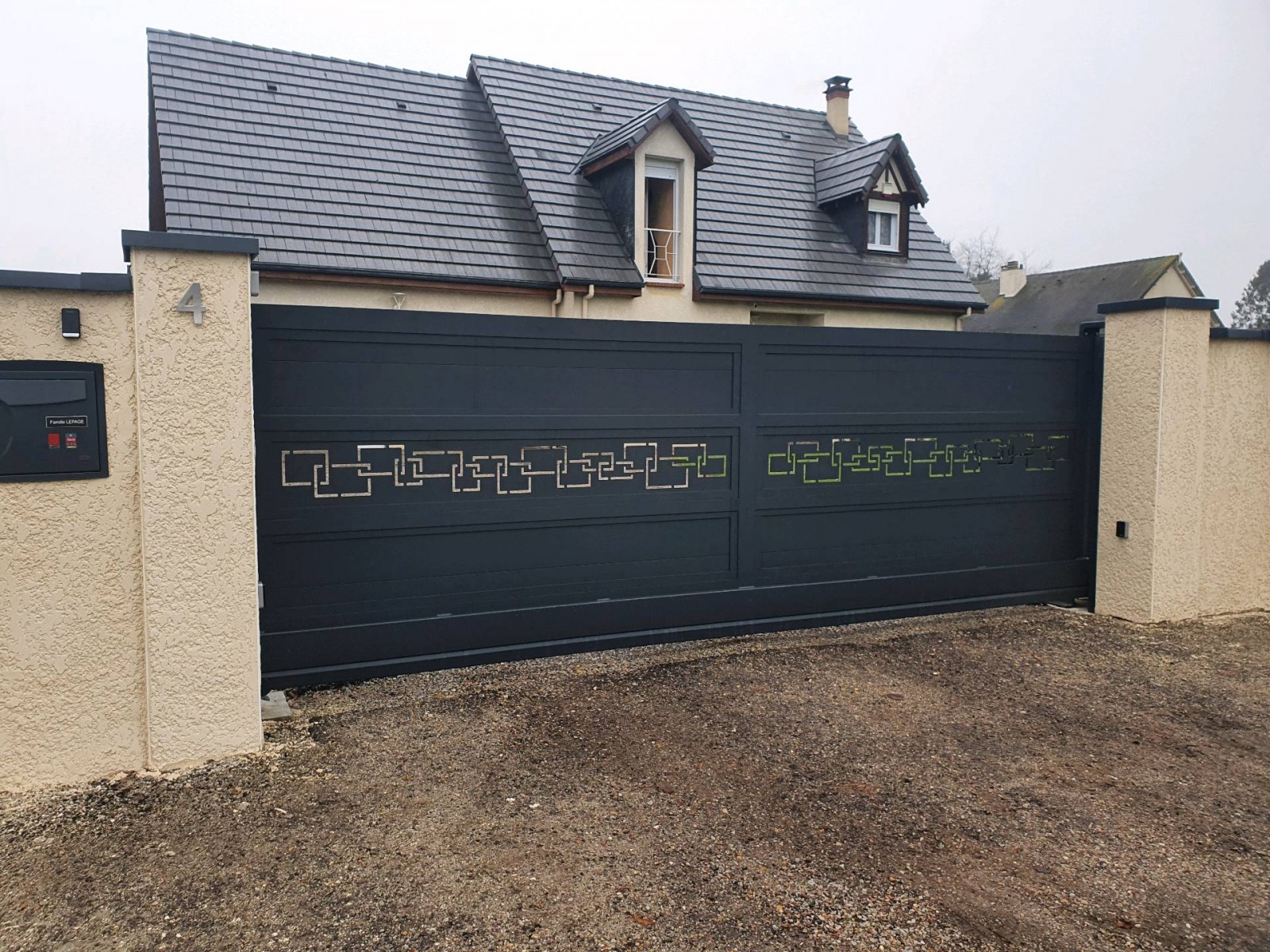 Réalisation d'une pose de portail aluminium autoportant de 4m de longueur motorisé par Leroy Fermetures (27). L'avantage de cette solution c'est de ne pas avoir de rail entre les poteaux et pour le portail en lui même nous travaillons avec un fabricant qui garantie à vie ces réalisations.