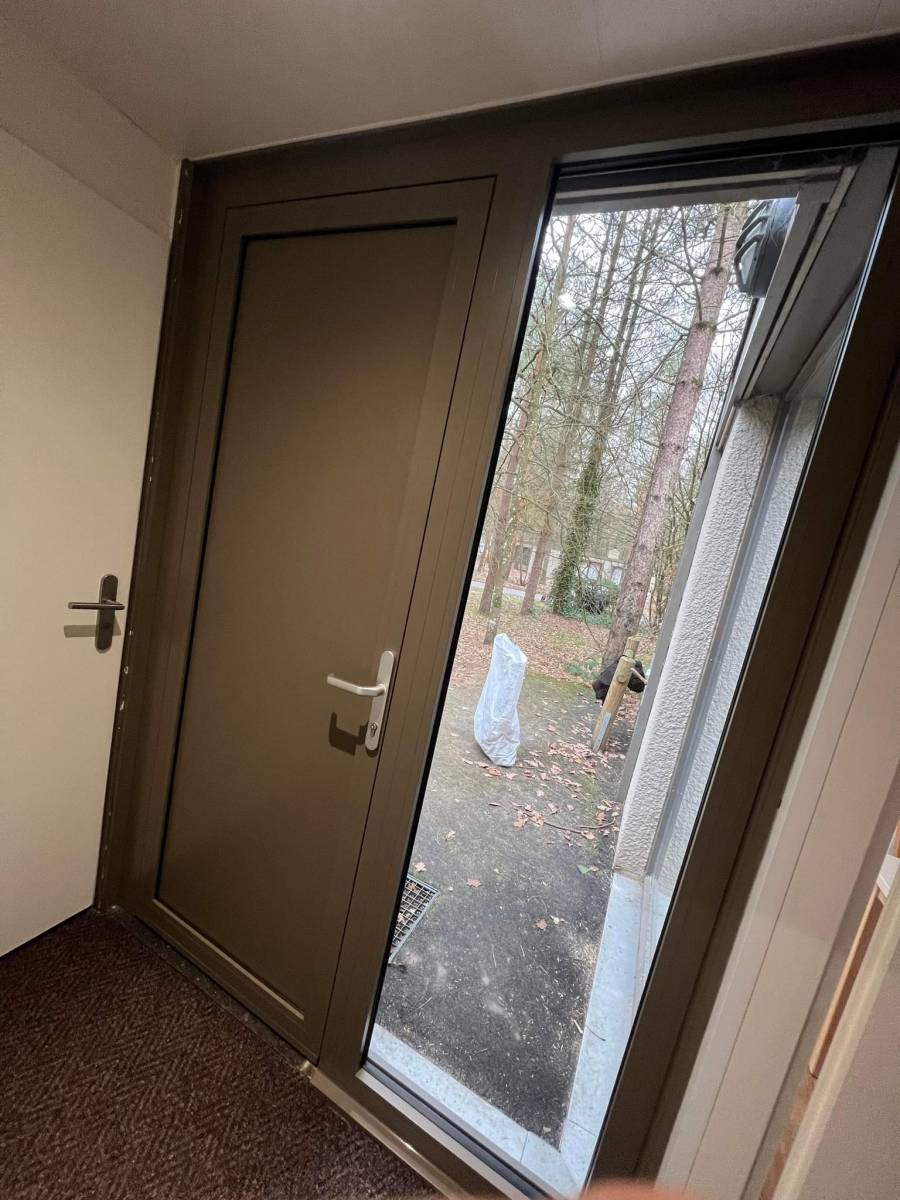 Fourniture et pose d'une porte d'entrée en aluminium avec un fixe RAL 7006 par Leroy Fermetures de Le Neubourg (27) chantier près de Breteuil sur Iton.